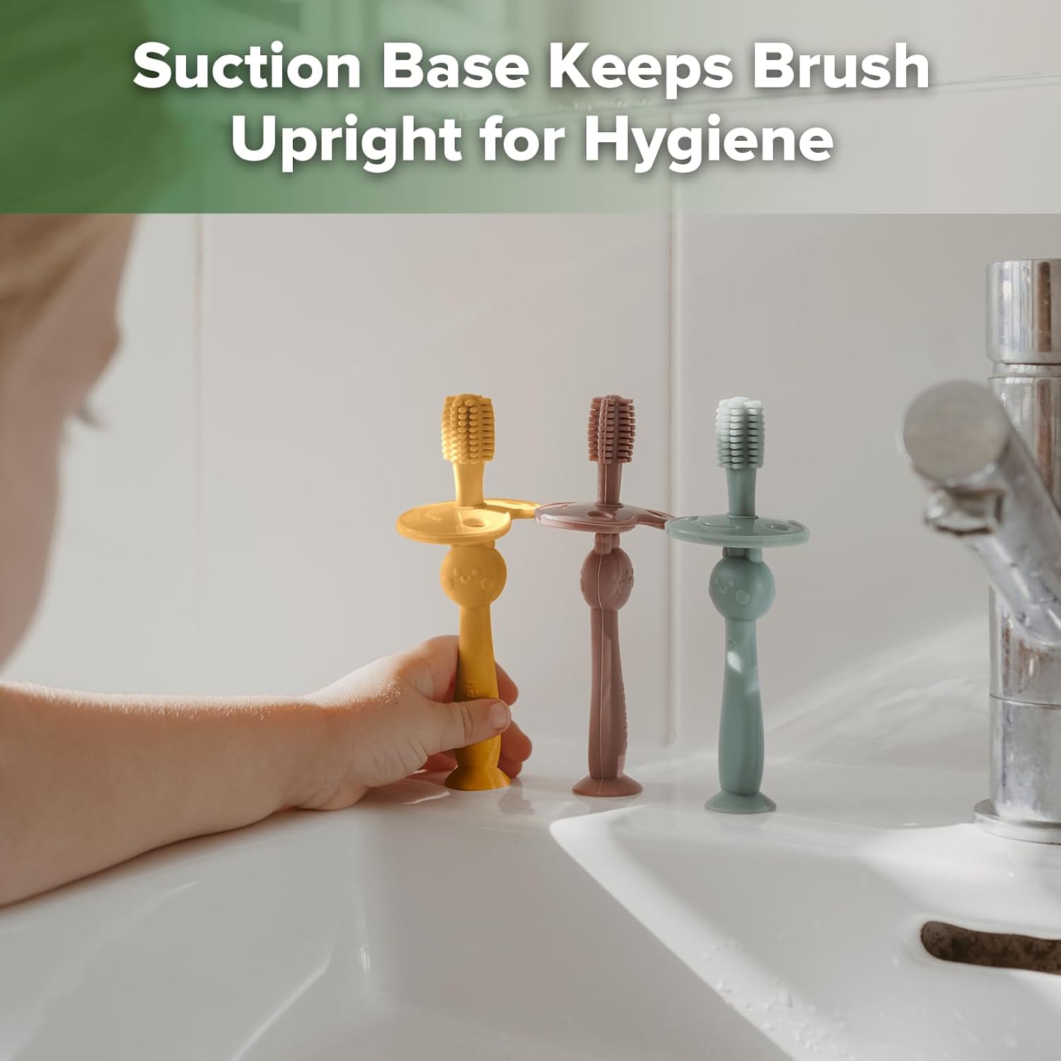haakaa 360° Baby Toothbrush with Suction Base - Gentle Cleaning for Toddler's Self-Brushing Training, Food-Grade Silicone, Adjustable Safety Shield - Mustard (1 Piece)
