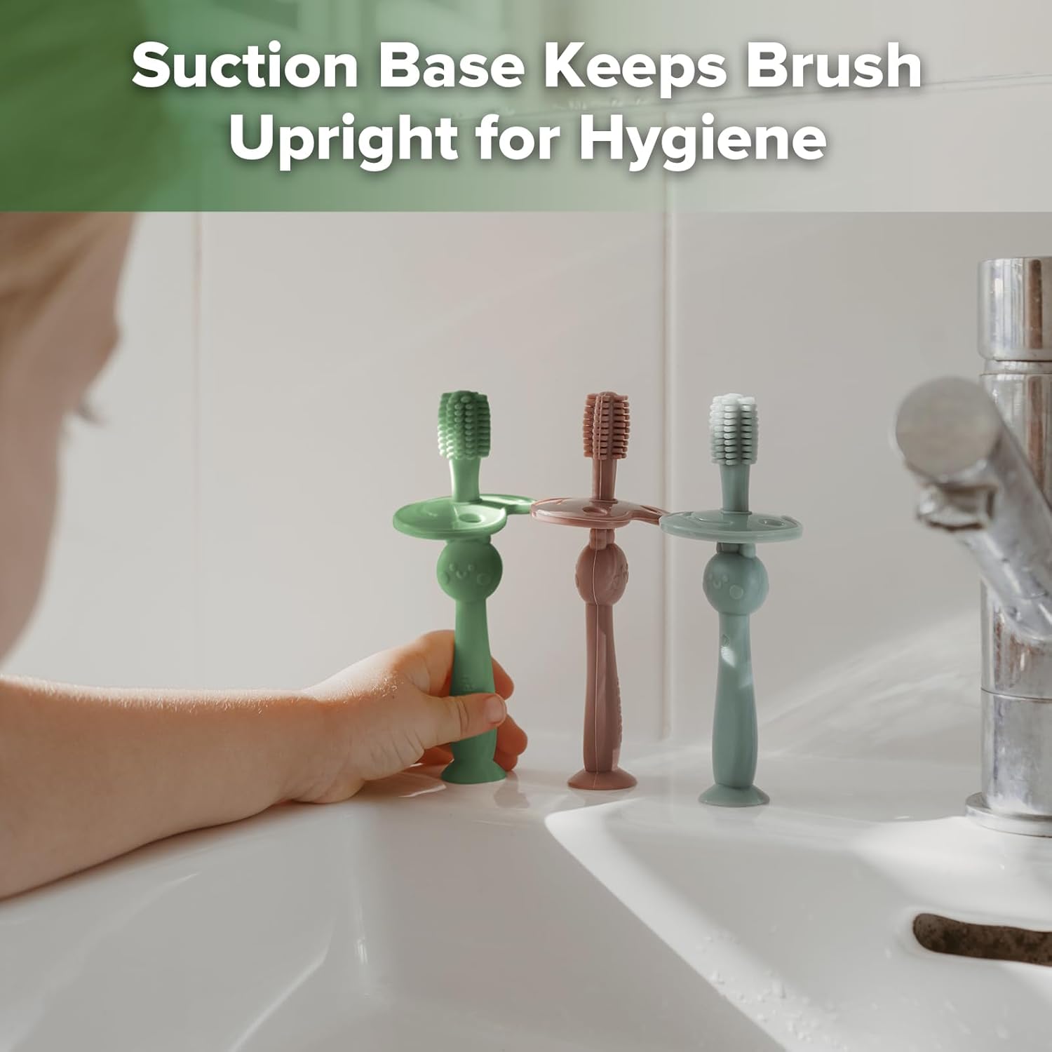 haakaa 360° Baby Toothbrush with Suction Base - Gentle Cleaning for Toddler's Self-Brushing Training, Food-Grade Silicone, Adjustable Safety Shield - Jade (1 Piece)