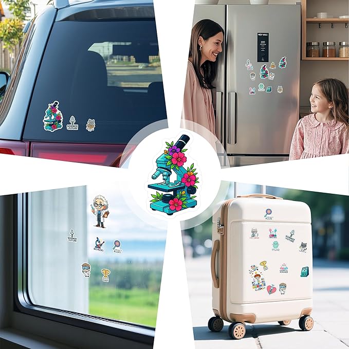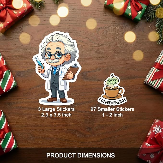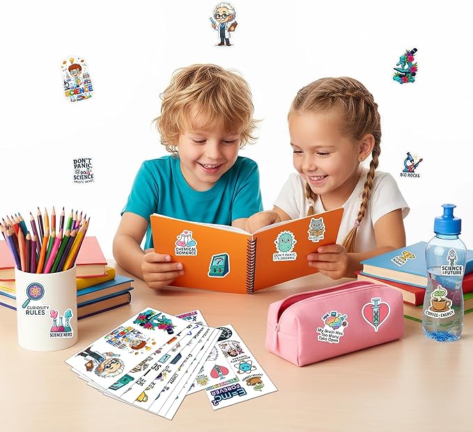 - 100-piece science sticker set – Includes colorful designs of DNA strands, atoms, microscopes, test tubes, planets, rockets, robots, formulas, and more STEM-inspired themes.