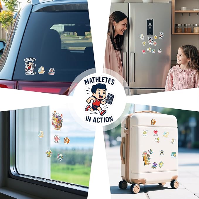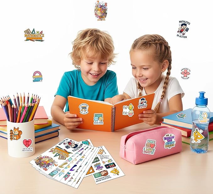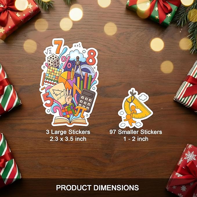 - 100-piece math sticker set – Includes colorful designs of numbers, fractions, geometry shapes, algebra formulas, calculus symbols, graphs, calculators, and pi icons.