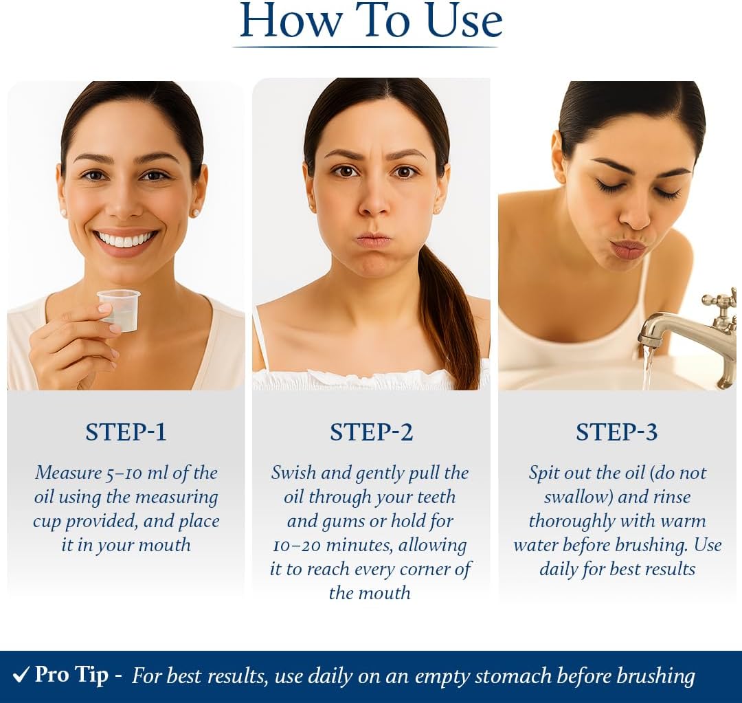- Perfect for Kavala & Gandusha: For Kavala, swish 1 tbsp for 5–15 min of oil through teeth & gums before brushing. For Gandusha, keep 1-2 tbsp in mouth for 5-15min.