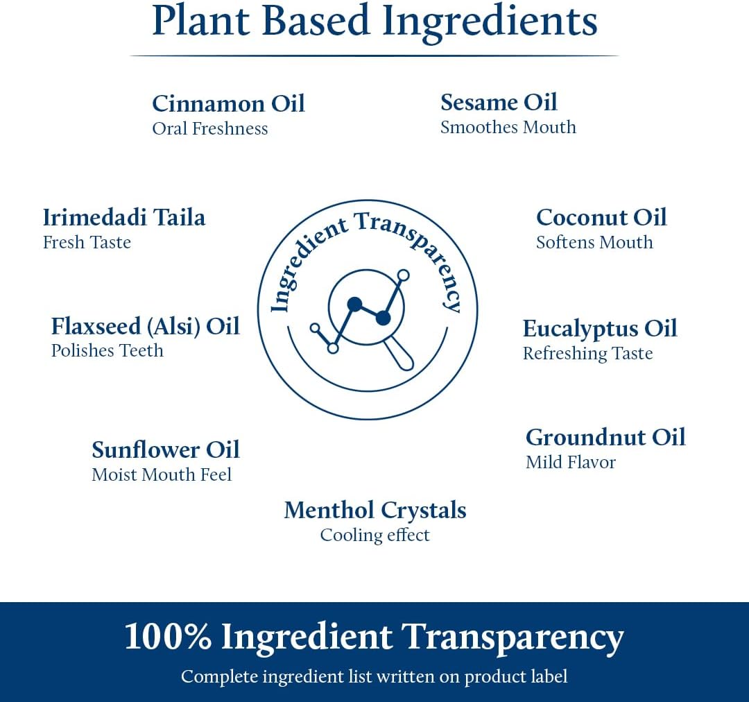 - Plant Active Cinnamaldehyde: Blended with Sesame Oil, Coconut Oil & Mint, Cinnamaldehyde from Cinnamon, has natural warming & cleansing properties, for comfortable gums and mouth feel