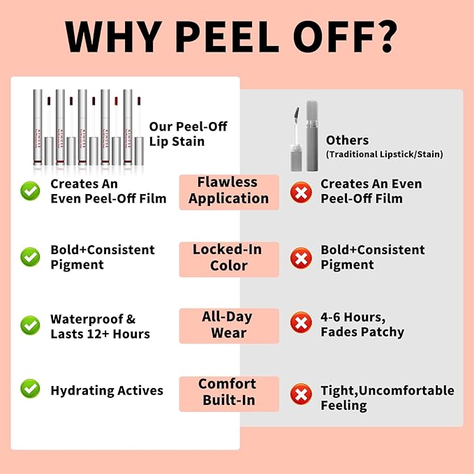 - LONG-LASTING WEAR - This lip stain peel off with waterproof and long-lasting formula that keeps your lips looking fresh all day long without smudging or fading. You'll be glamorous from morning to night.