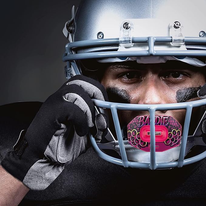 DAMAGE CONTROL Youth Football Mouth Guard – Breathable No Boil Mouthpiece, Protects Lips & Teeth, Works with Braces, Includes Helmet Strap – Sports Gear & Accessories (Baddie)
