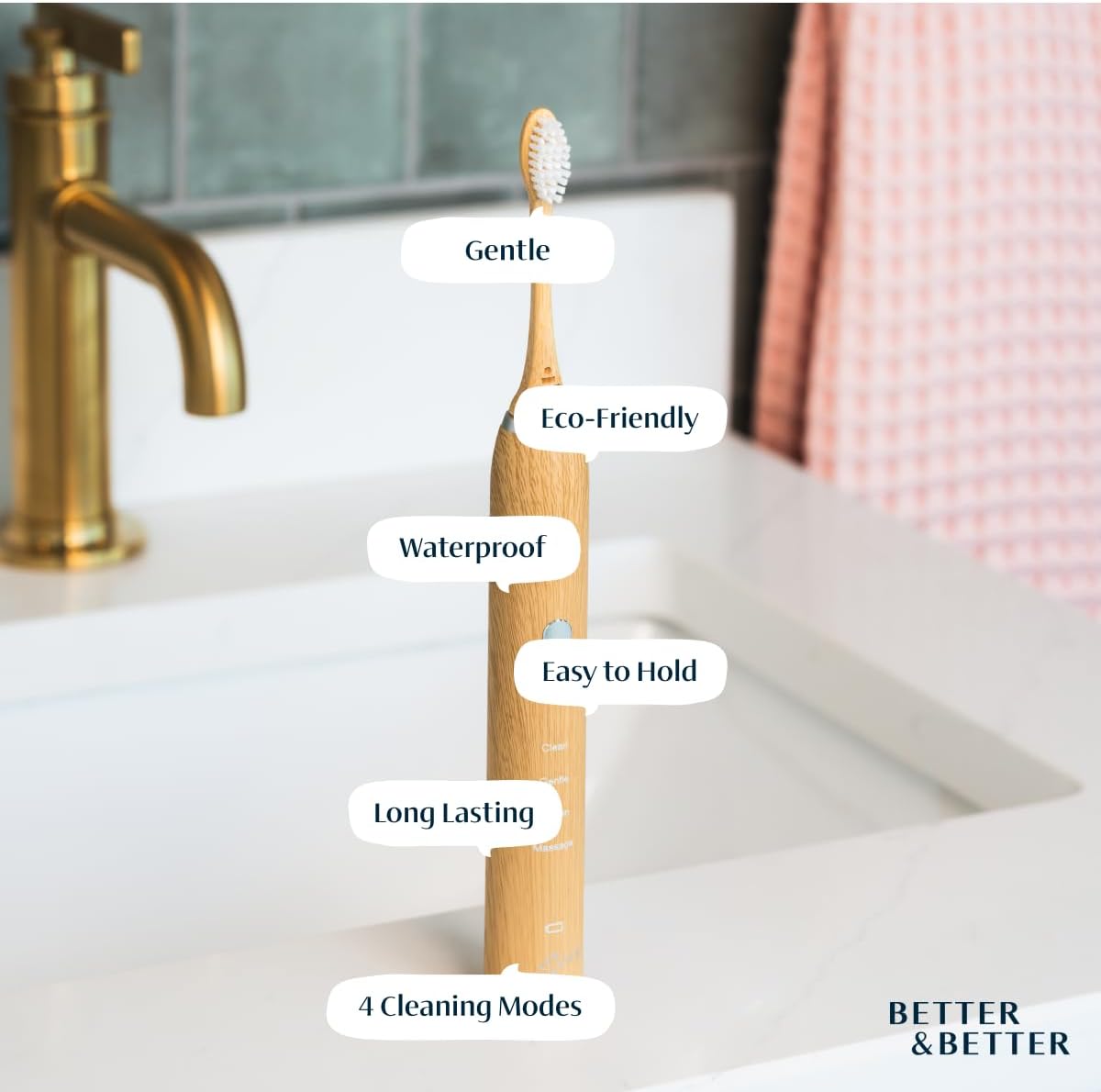 - A Cleaner Clean and Brighter, Whiter Smile: Elevate your brushing routine with Better & Better’s Bamboo Sonic Toothbrush for adults, designed with soft, natural, plant-based bristles made from castor bean oil. Delivering up to 37,000 microvibrations per minute, it gently polishes teeth and removes plaque. Choose from four cleaning modes to fit your daily needs.