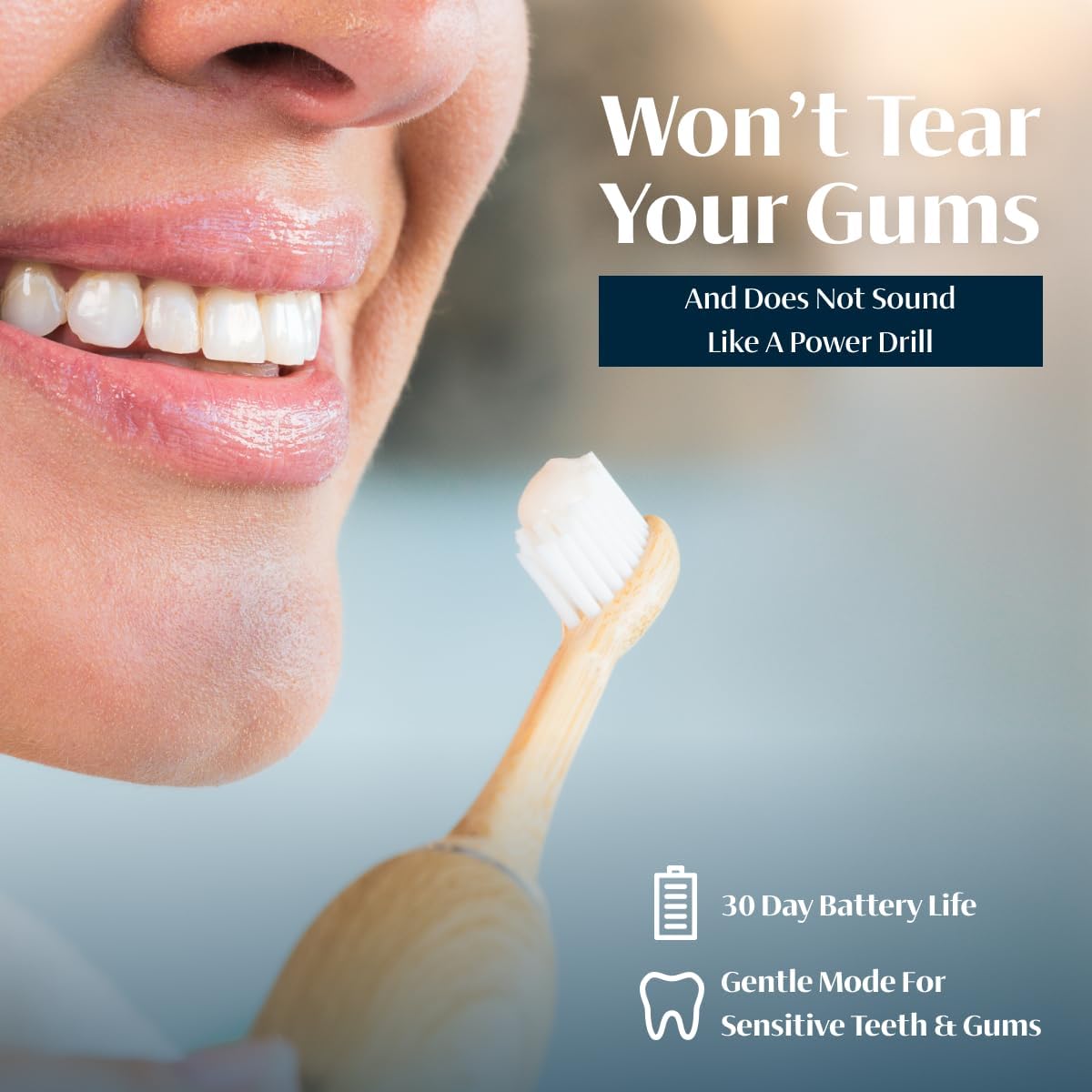 - Designed for Effortless Use Anywhere: Replaceable bamboo brush heads and a fully waterproof handle make brushing easy at the sink or in the shower. The long-lasting rechargeable battery provides up to 30-40 days of twice-daily use, perfect for home or travel.