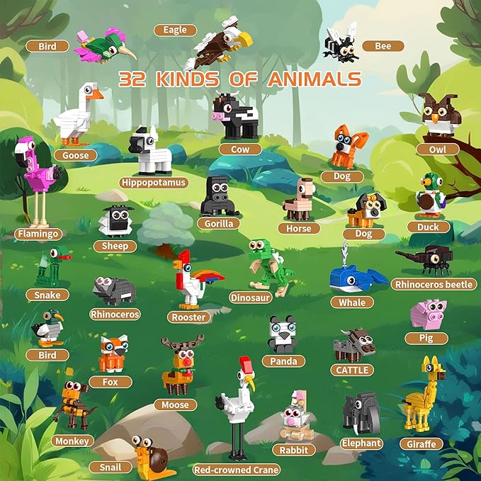 - 【32 Pack Animals Building Toys】EITOLNR Party Favors Building Block Set consists of 32 packs adorable mini animals, including Giraffe、Rabbit、Killer Whale、Parrot、Gorilla、Cow and so on, allowing kids to work with their hands and learn while playing