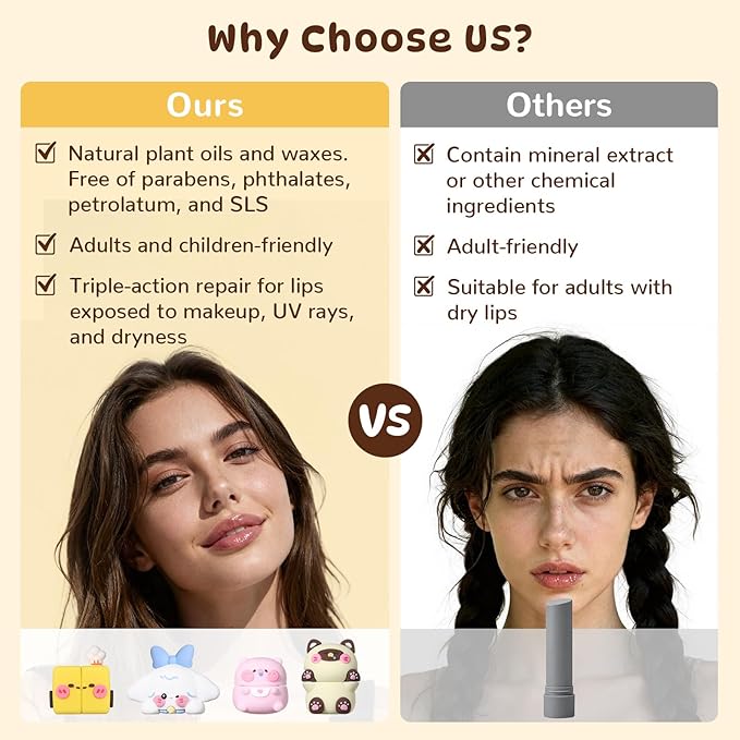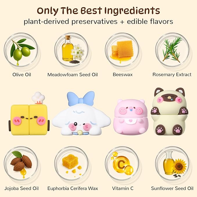 - Fun & Practical Packaging Design: Say goodbye to lip care struggles with kids. The playful packaging of this lip balm pack encourages children to use it daily, while its anti-slip wide design is perfect for little hands. For teens and adults, the adorable look adds a touch of fun and style, making it not just a lip balm but also a collectible accessory. Whether as a lip moisturizer for women or a reliable lip balm for kids, the packaging combines usability with personality.