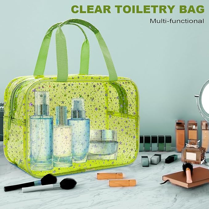 Clear Green Star Large Makeup Bag with Star Pattern 12x5x8 inch, Travel Cosmetic Bag with Handle, Durable PVC Material Washbag Zipper Opening Design for Makeup Travel Organizer or Gym Use