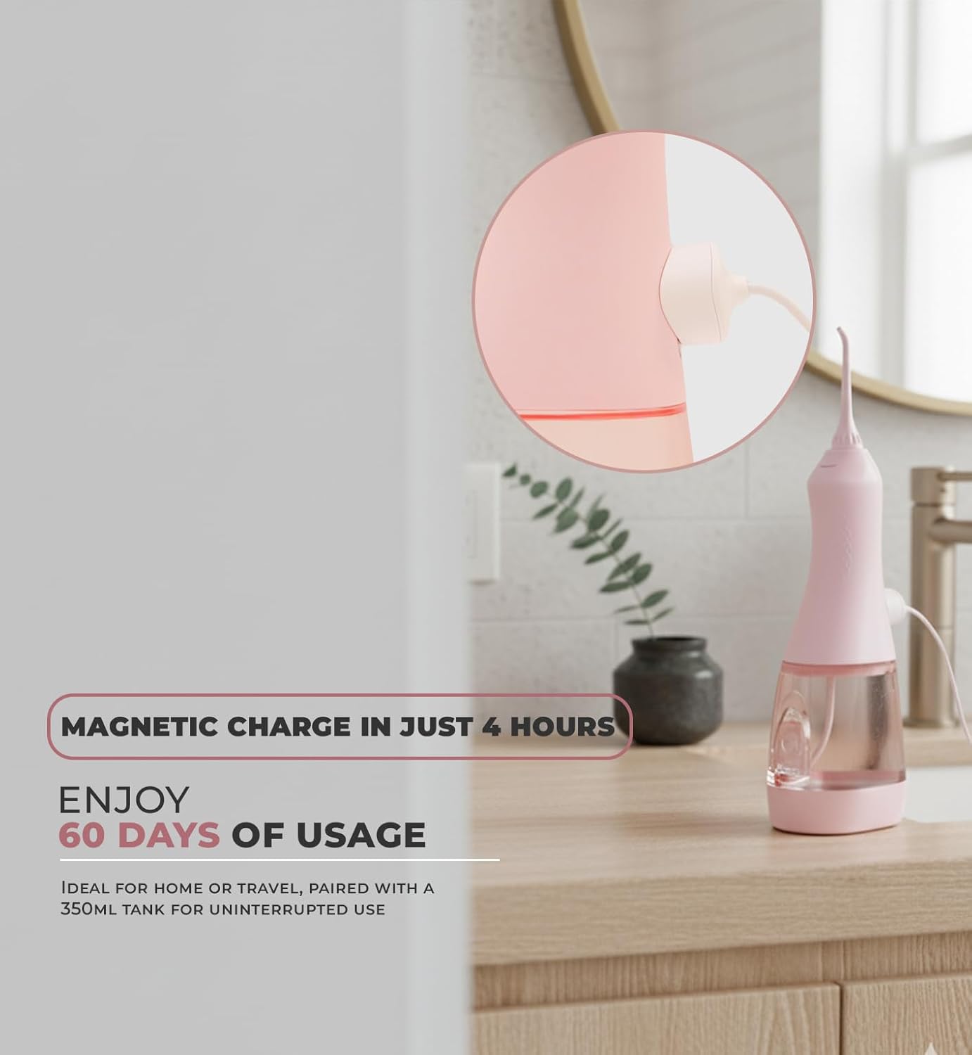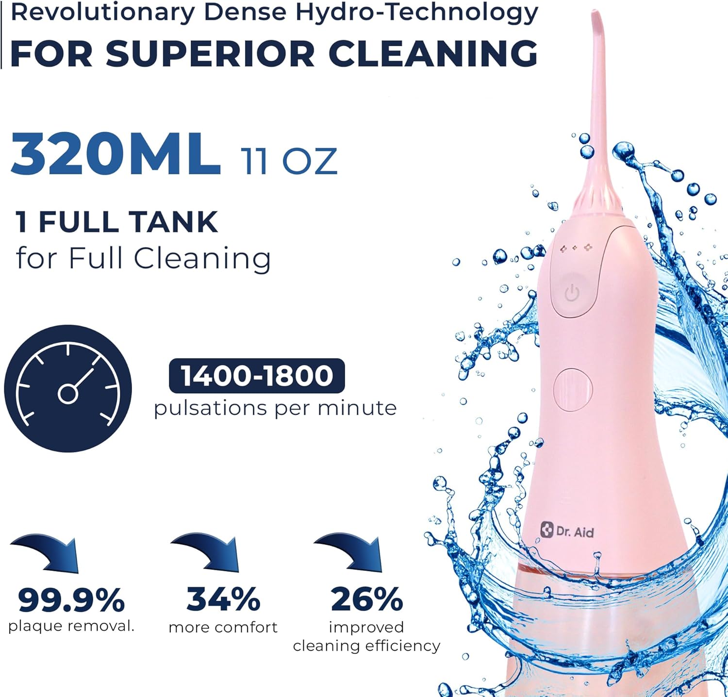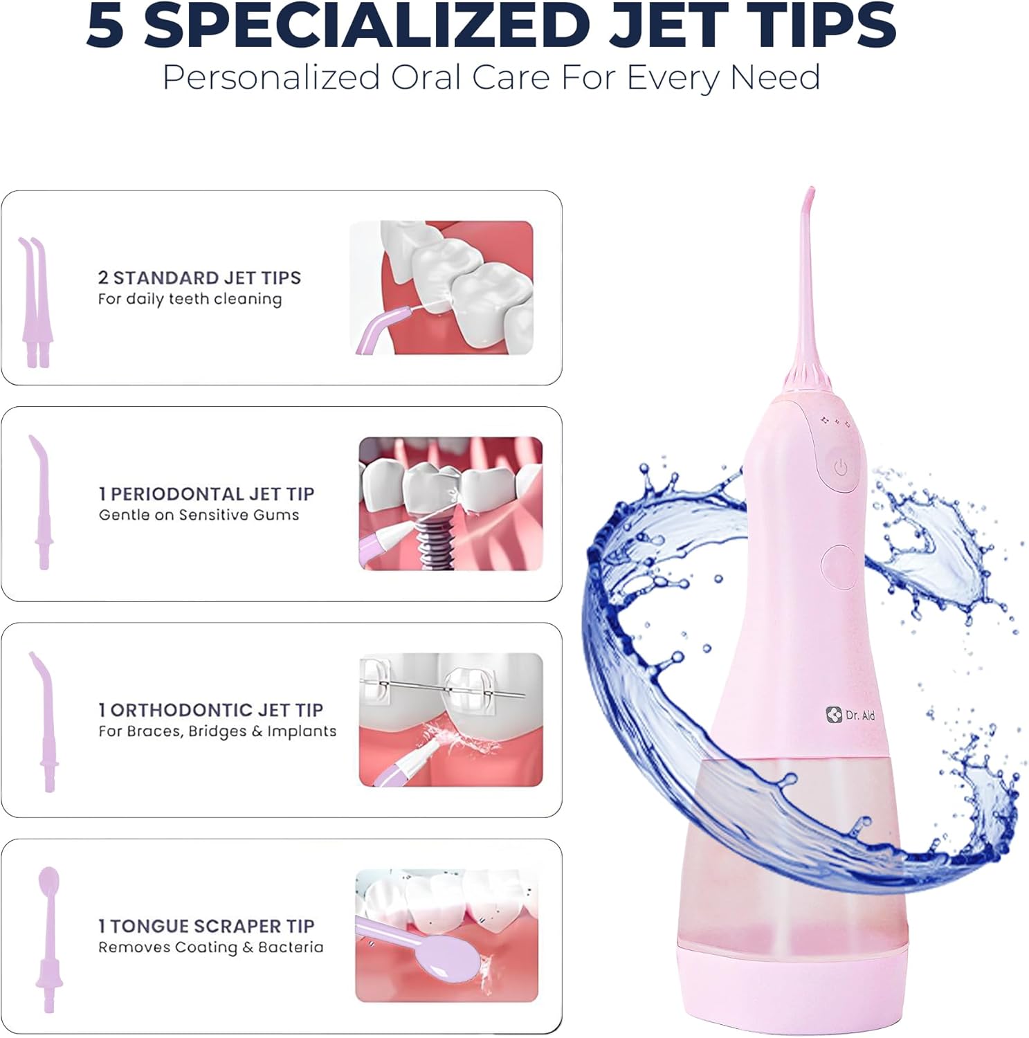 Dr. Aid Dental Water Flosser – Portable Oral Irrigator – 11Oz Tank, Water Filter, 5 Tips, Magnetic Charger – IPX8 Waterproof Cordless Water Flosser, Ideal Water Flossers for Teeth, Gums (Pink)