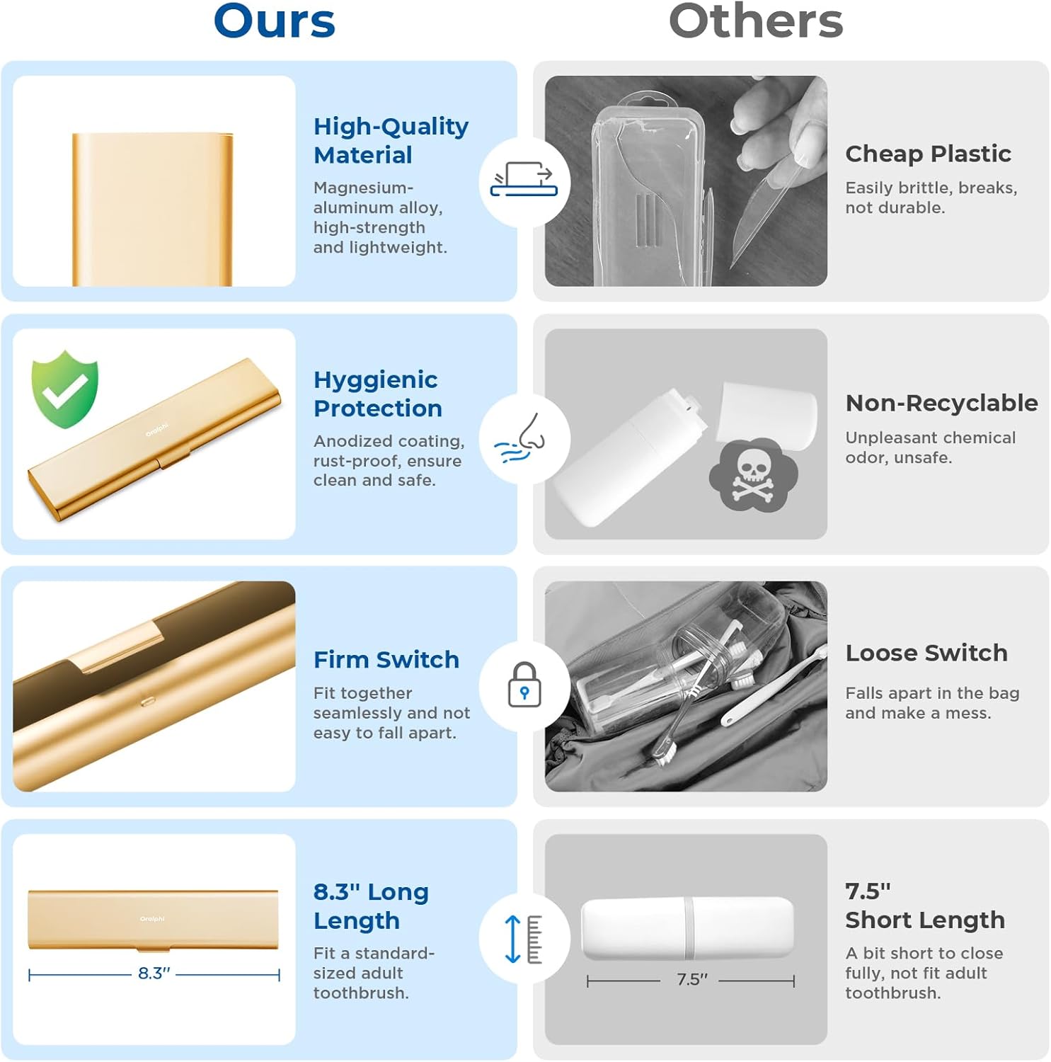 - High-Quality Material: Made of food-grade durable aluminum alloy, our metal travel toothbrush case is safe, non-toxic, odorless, and rust-free. Say goodbye to the common problem of the brittleness of plastic, as our toothbrush container stands the test of time with its robust build. Ensures your toothbrush stays clean and safe