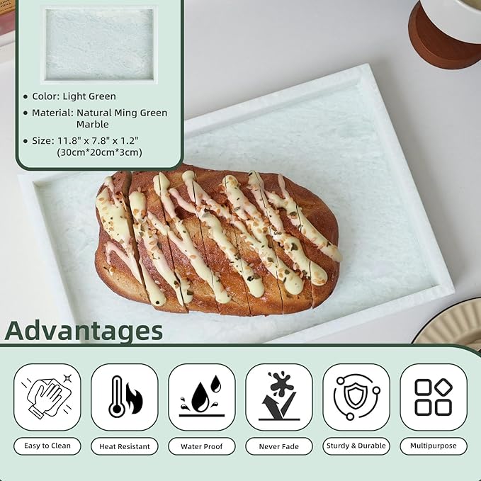 - 【NATURAL MARBLE】- Made of natural Ming Green Marble. The overall color is natural jade-like light green. The veins of each marble tray are unique. Non-resin, non-ceramic