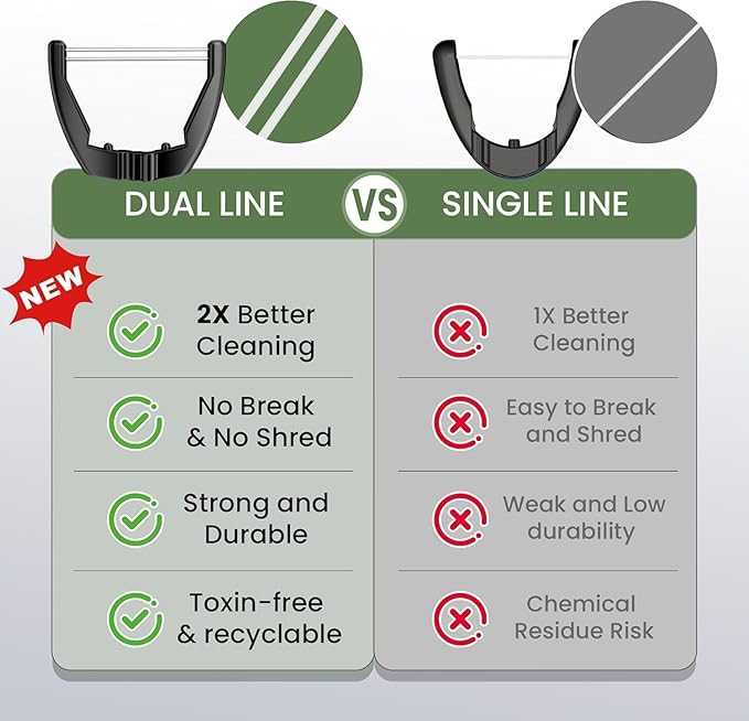 - 【Upgraded Dual-Floss Design & 5X Efficiency】- The flosser engineered with double-line floss that resists stretching, shredding, and snapping—unlike fragile single-line options. Confidently remove trapped debris and achieve a deeper clean, removing 2X more food particles than standard floss to fight bad breath and plaque at the source. Achieve a thorough clean in just 60 seconds—working 5X faster than traditional flossing.