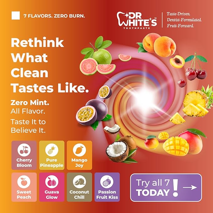- ✅ A BOLD BURST OF PASSION IN EVERY BRUSH — SWEET, TART, UNFORGETTABLE. Passion Fruit Kiss delivers bold, tropical flavor in a fluoride-free, sensitivity-soothing formula. Powered by nano-hydroxyapatite (nHA) and Dr. White’s Sensitivity Relief Complex, it’s mint-free, science-forward, and surprisingly sexy for a toothpaste.