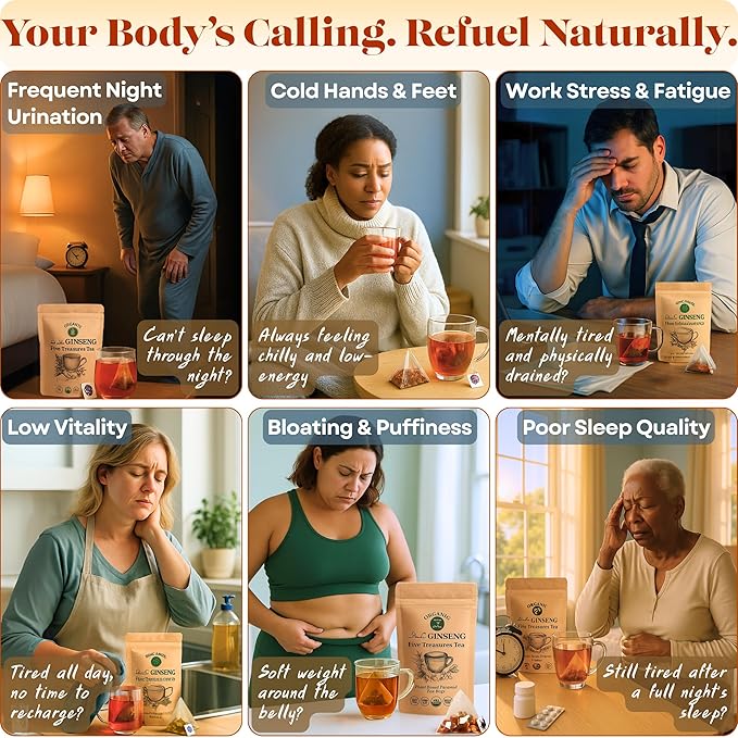- 🌿 TRADITIONAL FIVE TREASURES FORMULA – Rooted in ancient wellness traditions, this blend combines ginseng, maca root, and five herbal treasures to nourish and rebalance. A trusted kidney tea formula for daily use.
