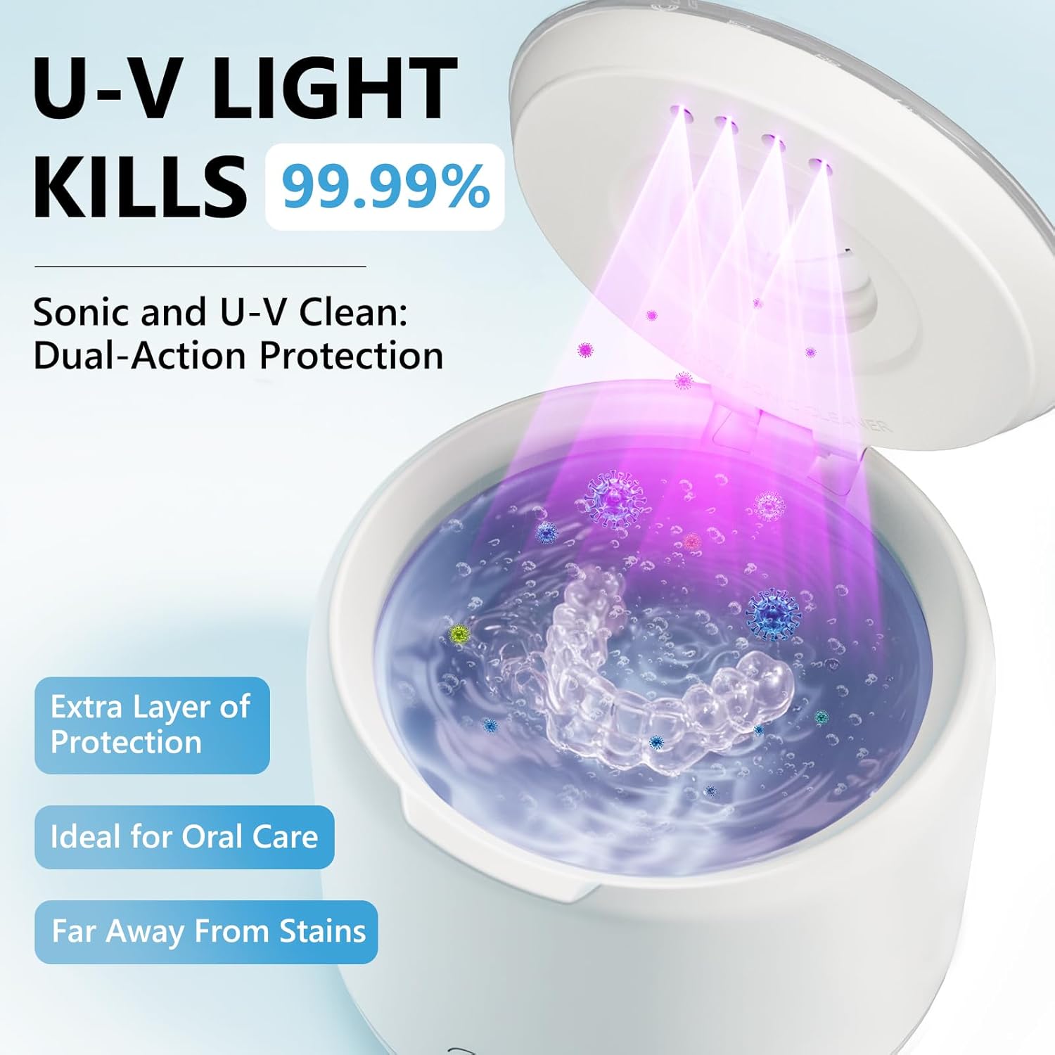 - INTEGRATED SYSTEM FOR ENHANCED FRESHNESS: Go beyond surface-level cleaning. Our advanced system activates a multi-wavelength purification phase during the cleaning cycle, working to neutralize odors and maintain long-lasting freshness for your oral appliances. This dual-action approach combines powerful ultrasonic technology with targeted purification, ensuring your retainers and dentures not only achieve a visibly clean appearance but also feel revitalized and refreshed