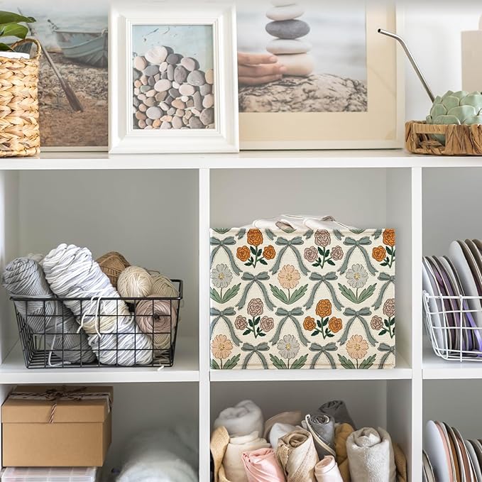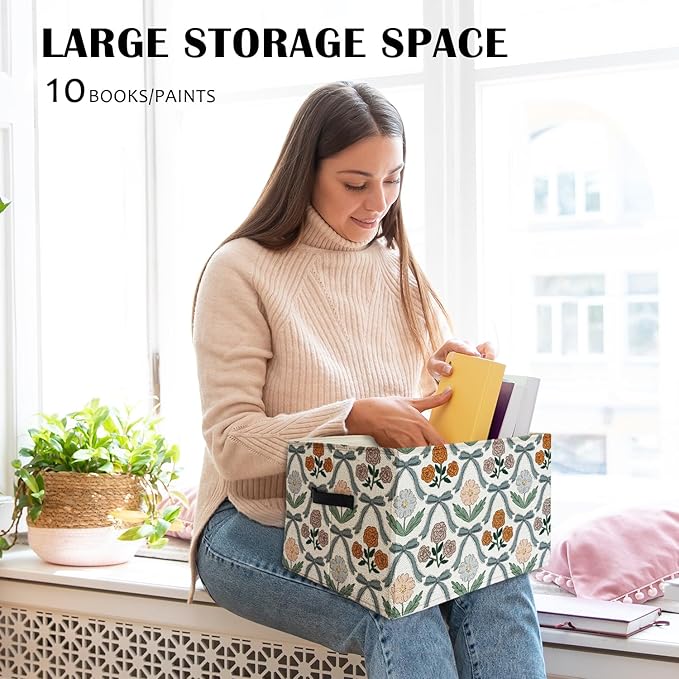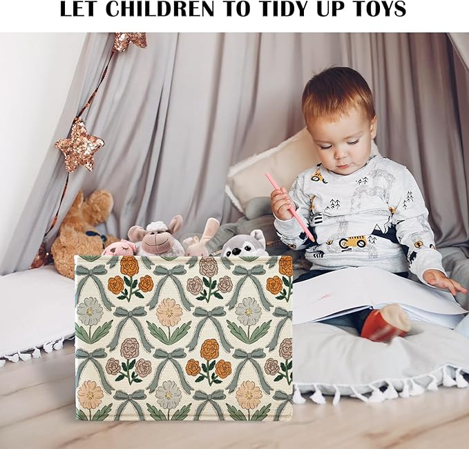 Coquette Blue Bow Floral Rectangular Storage Basket Organizer Bin Box with Handles,Girls Room Decorative Storage Baskets Toybox for Girls Room Dorm Bedroom Bathroom Clothes Toys Books