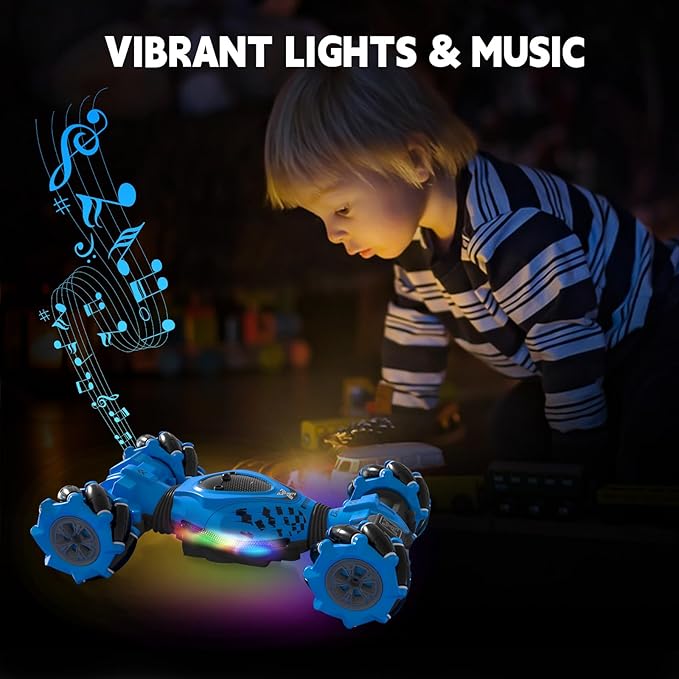 - The Perfect Birthday Gift for Kids Boys Ages 4-12: This no-assembly gesture stunt RC car arrives ready to race right out of the box! Customize the fun by choosing from different lighting schemes or turning them off, and even change the music to match the action. With two batteries included for the car, playtime is doubled and charging waits are eliminated. (Note: Wristband battery is included; AAA batteries for the remote are not). Designed for durability and packed with exciting features, it's guaranteed to keep kids entertained for hours.