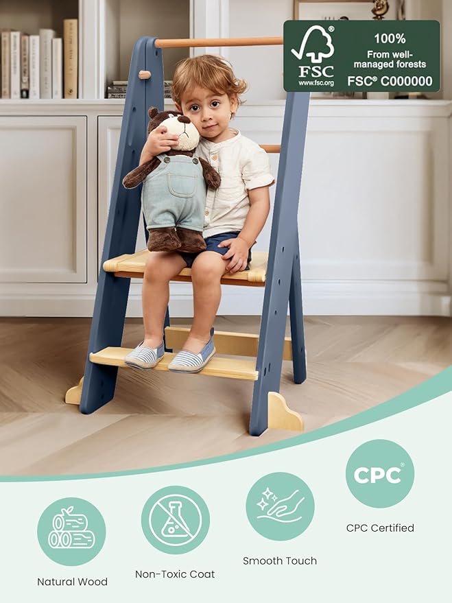 - Grows with Your Child: This toddler standing tower designed for ages 1.5–6, this solid beechwood stool supports 220 lbs and adapts to growing toddlers with 3 adjustable heights for different needs.