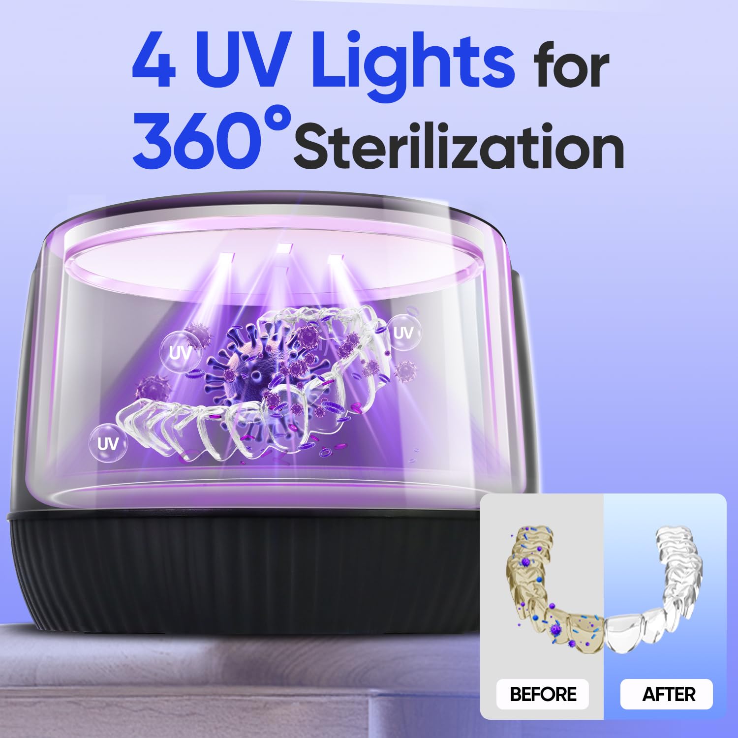 - 4 Light-Assisted Cleaning Lamps – Equipped with 4 efficient lamps for 360° support, the ultrasonic retainer cleaner works together with ultrasonic action to provide thorough and consistent cleaning coverage.