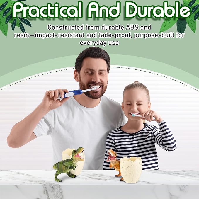 - Fun Dino Design: this dinosaur toothbrush holder combines a playful dinosaur and egg design, creating a cute and practical accessory for bathroom, helping to encourage child regular brushing habits; The set includes two vibrant colors green and orange, dimensions are 5.12 x 4.72 inches/ 13 x 12 cm, aim to suit different preferences and making dental care more enjoyable and engaging for kids