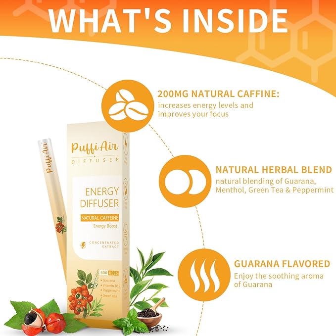 - Powerful Energy-Boosting Blend: Infused with Guarana, Green Tea Extract, Peppermint, and Menthol, this herbal diffuser delivers a natural, sustained energy lift to fight fatigue and keep you focused throughout the day.