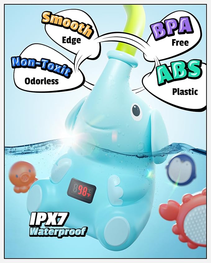 - 【Water Temperature Monitoring】: The elephant-shaped body of the baby bath shower head works when in contact with water and can automatically measure the water temperature. An LED screen displays the current water temperature in Fahrenheit in real time, ensuring that the water is at the right temperature for your baby's bath, providing safety during bath time