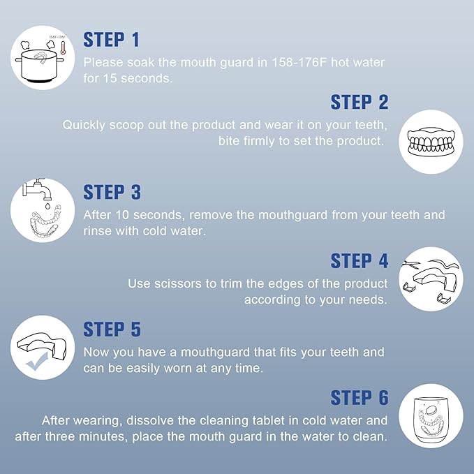 - User-friendly application: Soften the mouthguard in hot water at 158-176°F for 15 seconds, shape it by biting down, and trim it to fit your teeth contours for a comfortable, secure fit that resists slippage. The provided storage box ensures convenient daily storage, keeping the mouthguard clean and organized at all times