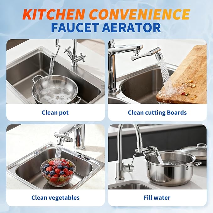 - SWIVEL FAUCET EXTENDER AERATOR - Unmatched Flexibility & Total Control - Effortlessly direct water flow and adjust the spray head to any angle you need. This heavy-duty gooseneck arm extends, retracts, and rotates, making it easy to fill large pots, clean every corner of the sink, or use two compartments simultaneously without ever struggling with a stiff faucet again