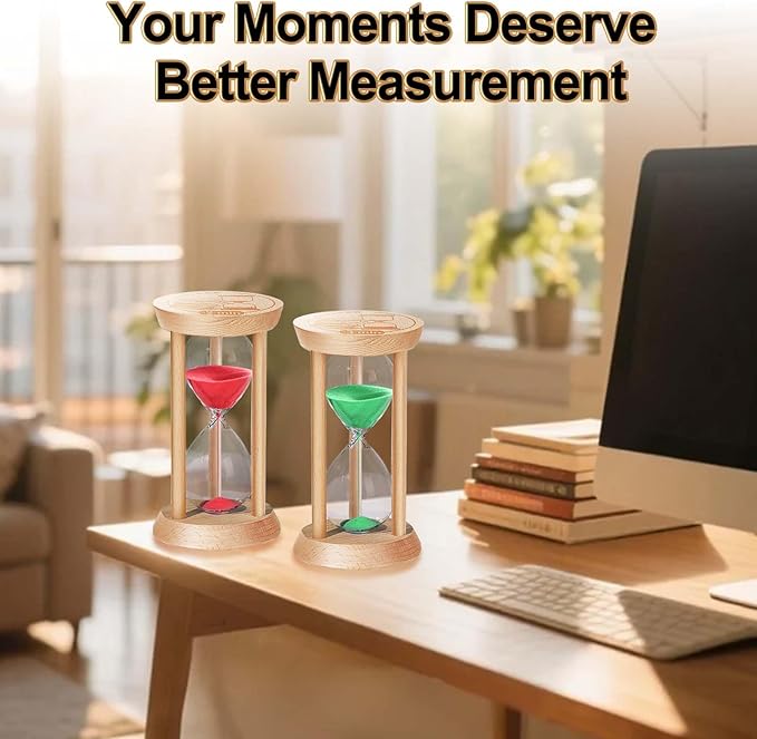 - Ultra-Smooth & Silent Timekeeping Sand Timer 1/2/3/5/10 Minutes: Featuring vibrant sand colors and a sleek wood & glass construction, the sand hourglasses aren't just a timer—they are the mini work of arts for your desk, kitchen, or meditation space! Watch the fine sand flow effortlessly with zero noise, helping you stay focused during work, workouts, or even a calming mindfulness break.