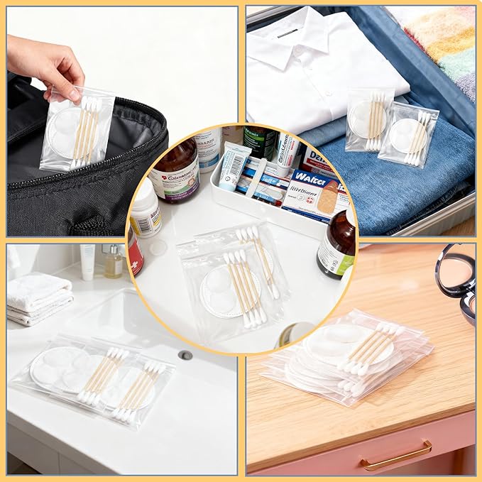 - 1.Sufficient quantity:This package includes 50 bulk vanity kits.Makeup removal cotton pads contains 4 cotton swabs,2 cotton balls,2 Cotton Rounds.Perfect for skincare,hygiene,and makeup needs while traveling.