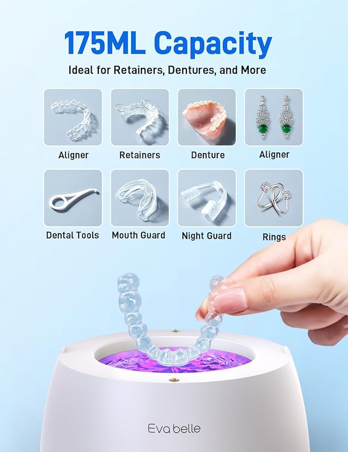 - 【EFFICIENT UV Technology】EVA BELLE retainer cleaner effectively provides a higher level of cleanliness to removes 99.9% of stubborn stains, keep your dental appliances clean and fresh. It can also be used in conjunction with cleaning tablets to tackle stubborn stains and odors for more superior cleaning results. (Note: Cleaning tablets are not included.)