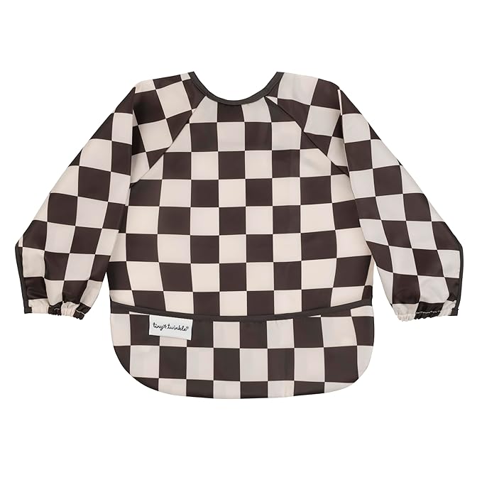 Tiny Twinkle Long Sleeve Bib for Babies & Toddlers – 2 Pack Waterproof Smock Bibs for Eating – Machine Washable & Mess-Proof, Baby Feeding Essential & Shower Must-Have (Black,Sage Checkers, 6-24M)