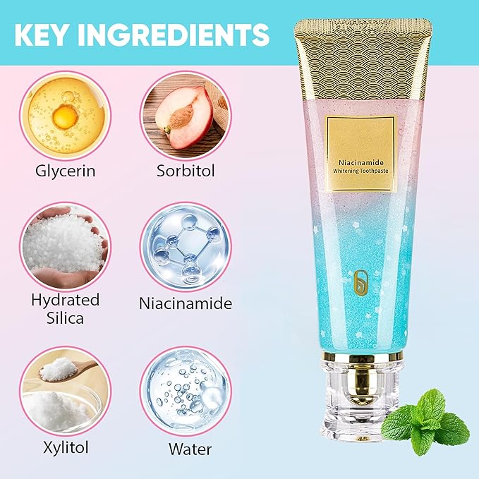 - 💦Strengthens Gum Health: This nourishing niacinamide toothpaste helps alleviate tooth sensitivity, strengthen fragile gums, and prevent bleeding. Enjoy a delightful daily routine with our refreshing Sakura Peach scent for improved oral care.