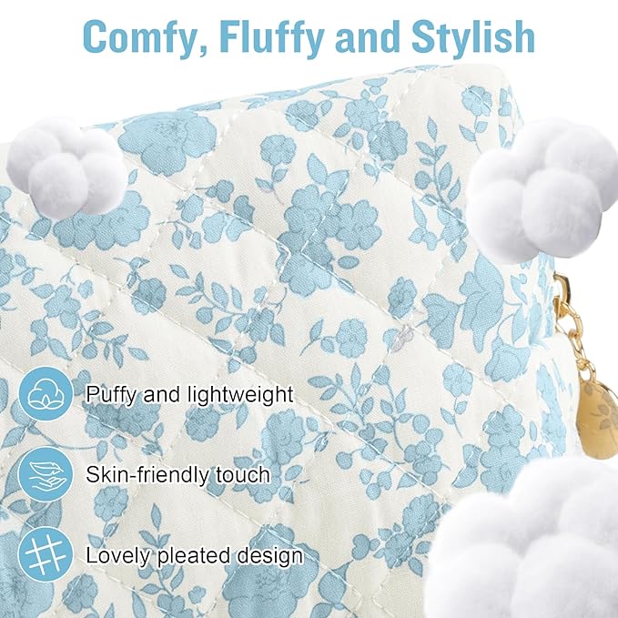 Personalized Quilted Cosmetic Bag, Puffy Monogrammed Christmas Birthday Gifts for Women & Girls, Cute initial Floral Makeup Bag Puffer Coquette Bag, Aesthetic Travel Toiletry Zipper Pouch(Blue,E)