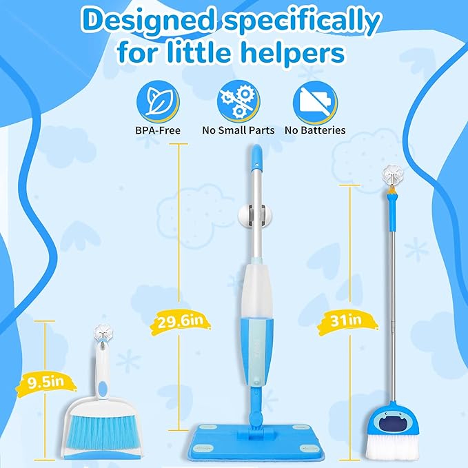 - 【Make Cleaning Fun & Educational】Turn chore time into playtime! Inspired by Montessori learning, this cleaning toy set lets your child become a real "helper" around the house. They’ll build confidence, learn responsibility, and boost motor skills—all while having a blast with practical, hands-on play.