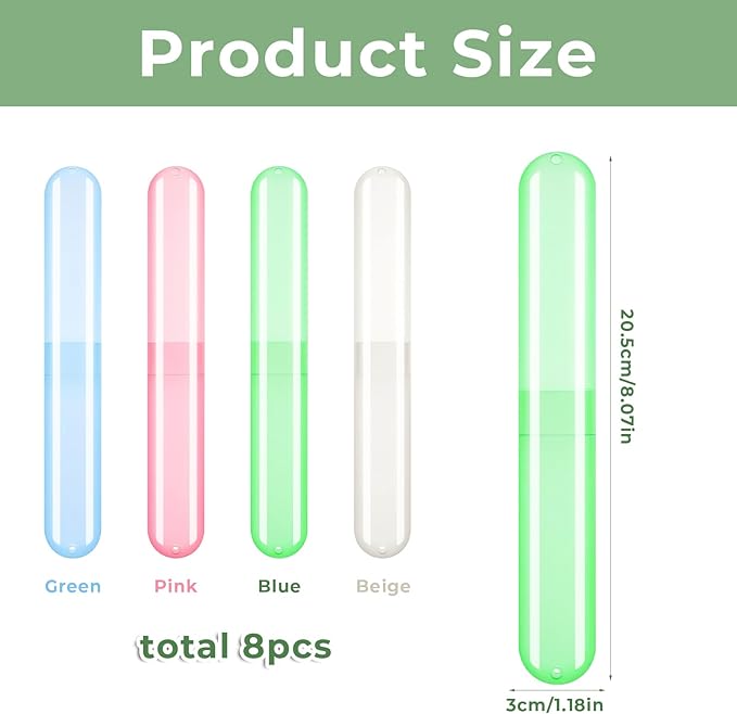 - PACKING LIST AND DIMENSIONS:This set comes with 8 toothbrush holders travel in Blue, Green, Pink, and Beige. Each case measures 8 x 1.18 x 0.78 inches, nice for keeping your toothbrush safe and organized. 4 Colors make you easy to distinguish toothbrush