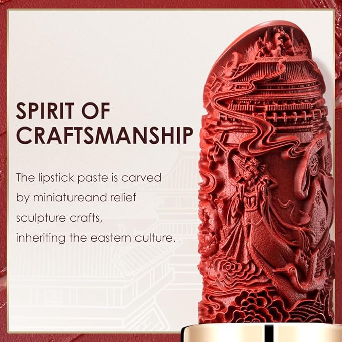 - 【Relief Sculpture Crafts】 The outer case of this lipstick is inspired by Chinese Traditional Paintings, inheriting the eastern culture. The outer case of this lipstick is inspired by Chinese Traditional Paintings, inheriting the eastern culture. And the lipstick paste is carved by miniature and relief sculpture crafts and to promote the aesthetics of the Chinese intangible cultural heritage to the world.