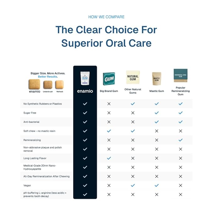 - HIGHEST NANO-HYDROXYAPATITE CONCENTRATION AVAILABLE: Enamio contains more nano hydroxyapatite than any other remineralizing gum on the market. This best-in-class hydroxyapatite gum delivers bioavailable calcium, the same mineral found in tooth enamel and is widely used in premium oral care products to support enamel health. Every piece delivers maximum mineral exposure with each chew, designed for those serious about enamel support and sensitive teeth relief.