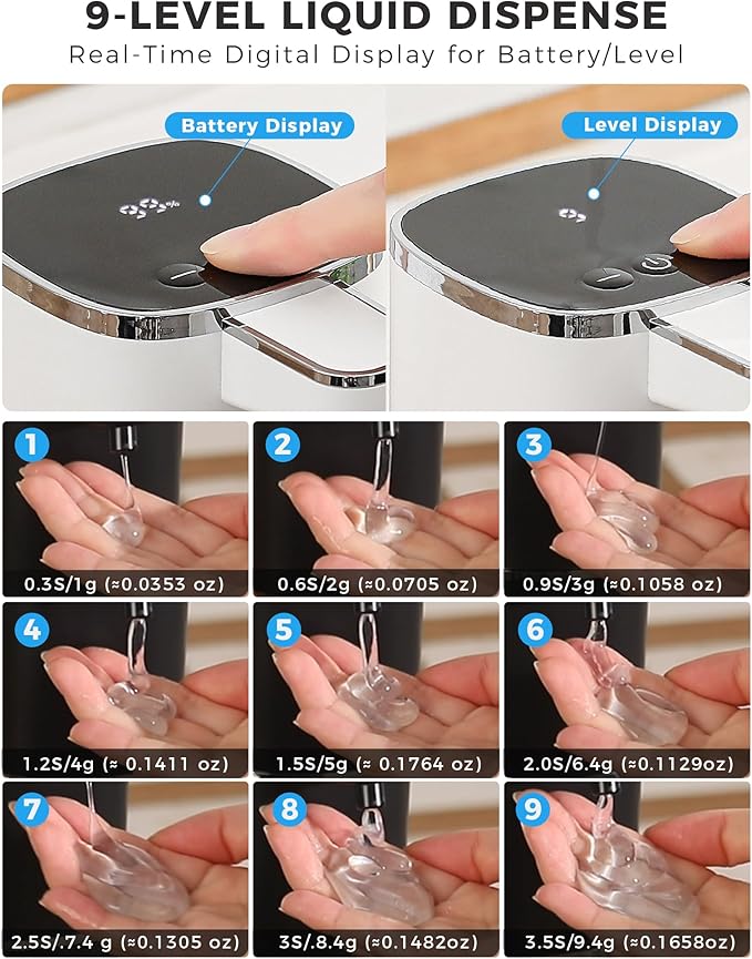 - 【0.25s Instant Dispensing + 9-Level Customization】Equipped with advanced infrared sensor technology, this touchless soap dispenser delivers liguid in just 0.25 seconds-totally touch-free. The adjustable function with 9 gear positions for liquid output perfectly meets families and businesses.