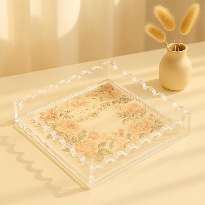 Acrylic Tray with Ultra-Strong Magnetic Mat- Customizable Serving & Display Tray, Clear Scalloped Vanity Jewelry Organizer, Picture Frame Bathroom Tray Decor, Unique Gift for Women Girls