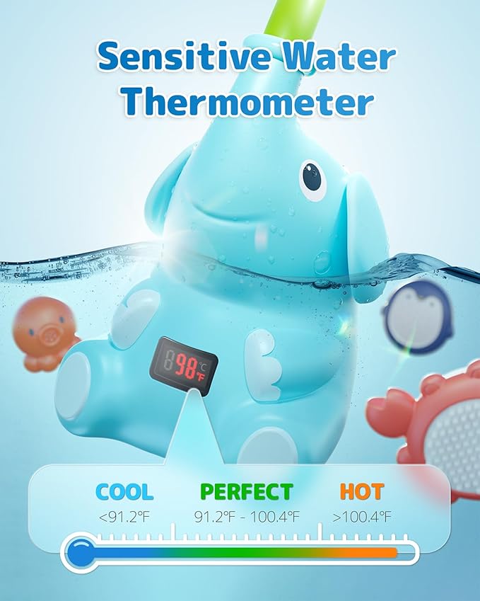 - TEMPERATURE CONTROL- Sumobaby elephant water pump baby bath toys comes equipped with a smart LED display and a baby bath thermometer gauge, allowing you to easily monitor the water's temperature and provide a warm and comfortable bathing environment for your little ones. It's also an excellent way for kids to grasp the concept of temperature