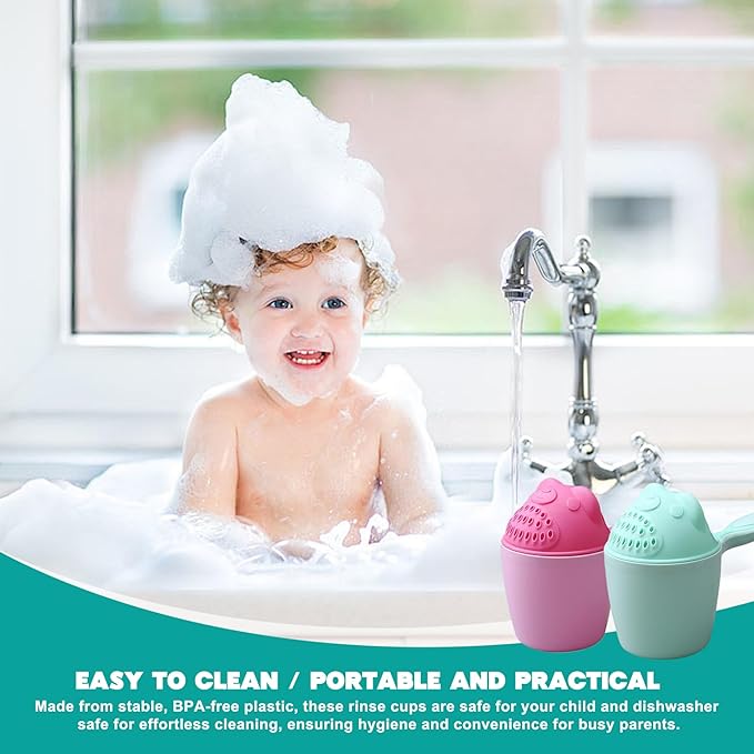 - Tear-Free Rinsing: Our 2Pcs Baby Bath Rinse Cup features a detachable waterfall design that safely rinses shampoo from your baby's hair without the fear of getting water in their eyes.