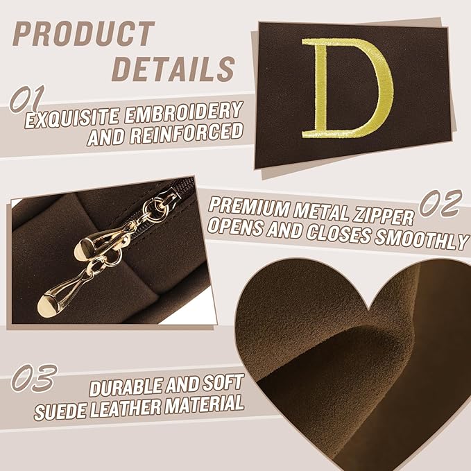 Personalized Initial Makeup Bag,Preppy Suede Cosmetic Bag for Teen Girls,Small Monogram Travel Toiletry Bag With Gold Embroidered Letter,Trendy Stuff Custom Christmas Gift for Women(Coffee-D)