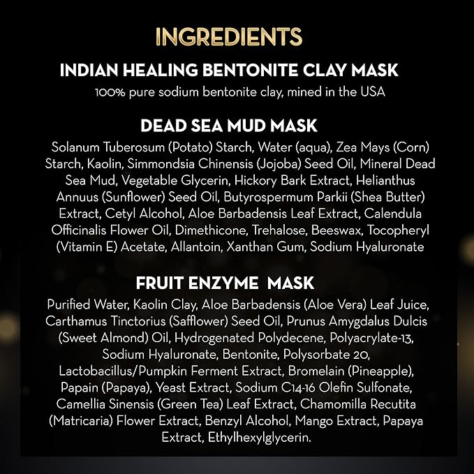 - Bentonite Clay Mask - A deep-cleansing purifying mask known as Indian Healing Clay, this mineral-rich mask draws out impurities and helps refine pores for a clean, balanced, and refreshed complexion.