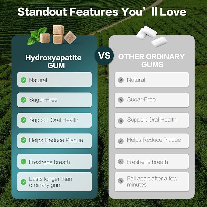 - Strengthens Enamel Naturally with Hydroxyapatite: Powered by hydroxyapatite (HA), a mineral commonly used in oral care. The chewing gum helps support the natural remineralization of tooth enamel--help support a healthier smile with every chew. A smart addition to your daily oral care routine.