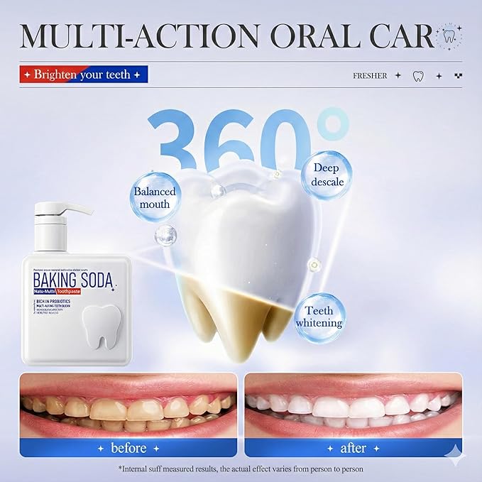 - 𦷠POWERFUL BAKING SODA WHITENING ā Harness the natural cleaning power of Baking Soda. It penetrates deep into enamel crevices to dissolve stubborn surface stains caused by coffee, tea, and food. Gently polish your teeth to restore their natural whiteness without harsh abrasives.